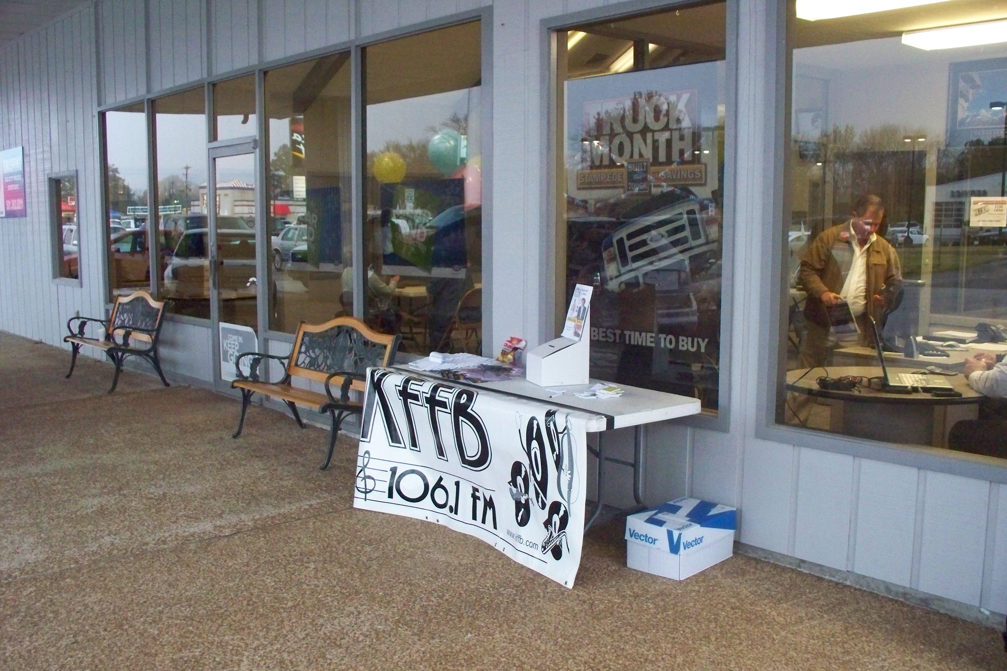 KFFB 106.1 on Location at Jayson Jones Ford November 15, 2011 Setting up the Registration Table Jayson Jones and KFFB 106.1 are number 1 Deals are being made Arnie and Dale talk deals Setting up for Lunch